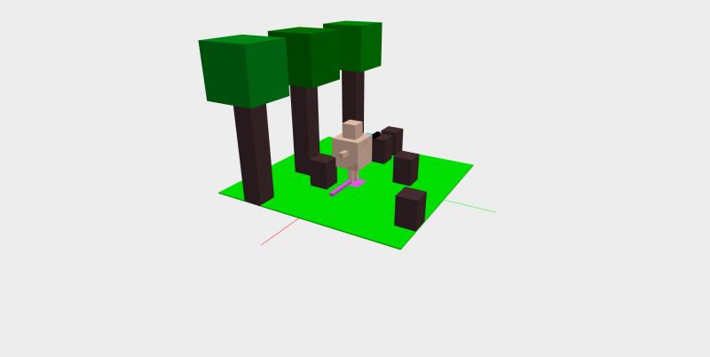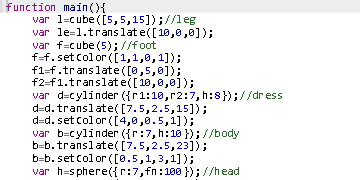 很有想象力,做了一个木偶娃娃,有58行代码。语法也比较工整,配色也比较合理。学了几次课就可以做出这种作品非常不错了!下一步学习需要用函数将复杂几何体封装,这样代码复用性会更高,也可以做出更复杂的作品,加油!