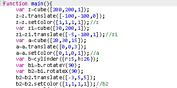 一看就是男孩子的作品,代码有66行。学了几次课就可以熟练进行创作,很不错! 下一步可以进行函数封装,用函数去封装更多的几何体可以让创作变得简单。超过50行代码,就要考虑函数封装了! 另外,还可以添加更多的几何体,尤其是黑色的地堡可以用循环做出更多,下一步还要进行高级的循环课程学习。
